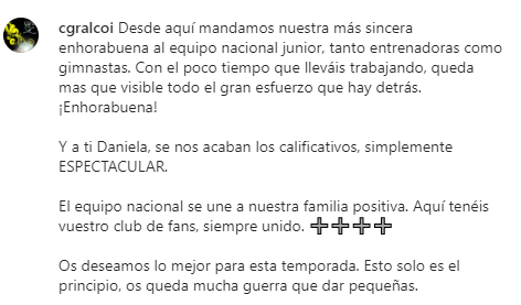 El Club Gimnastica Rítmica Alcoi, grupo donde se formó Daniela y que sigue todos los pasos de la gimnasta, publicó en sus redes sociales muestras de cariño y mensajes de enhorabuena para el conjunto junior.